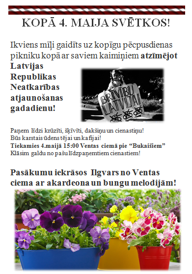 Ikviens mīļi gaidīts uz kopīgu pēcpusdienas pikniku kopā ar saviem kaimiņiem atzīmējot Latvijas Republikas Neatkarības atjaunošanas gadadienu!
