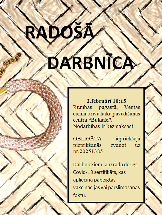 2.februārī Rumbas pagastā, Ventas ciema brīvā laika pavadīšanas centrā “Bukaiši” 10:15 “Radošā darbnīca”. Izgatavojam dažādas skaistumlietiņas: rotas, brošas, interjera dekorus u.c. skaitas lietas! Nepieciešamie materiāli ir uz vietas. Nodarbības ir bezmaksas!!! NĀC UN IZGATAVO ARĪ TU!