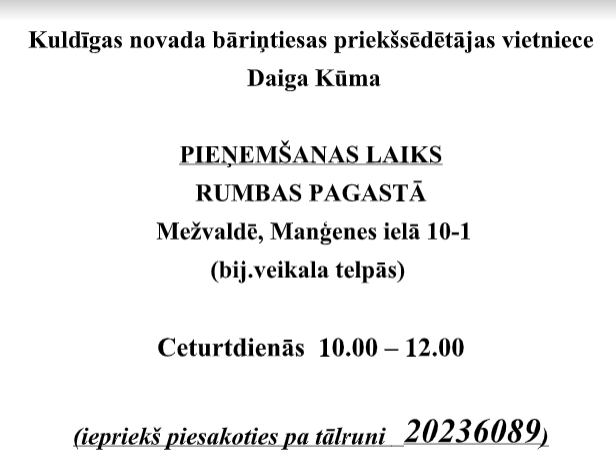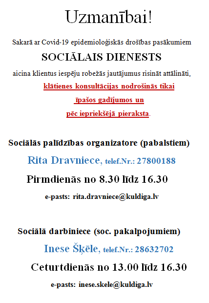 Darba laiks Sociālajam dienestam un bāriņtiesai Rumbas pagastā (pārvaldes remontdarbu laikā Manģenes ielā 10-1).