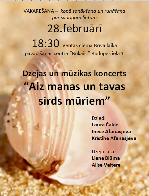 12.martā 13:00 Ventas ciema brīvā laika pavadīšanas centrā “Bukaiši”;