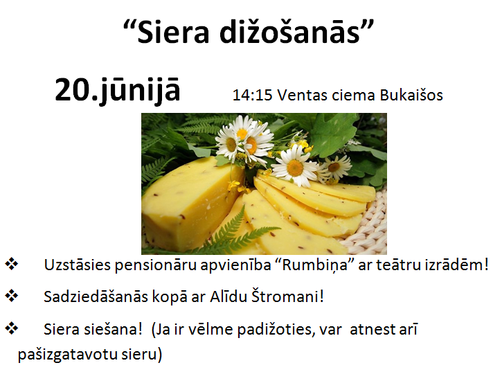 20.jūnijā 14:15 Ventas ciema Bukaišos “Siera dižošanās”. Uzstāsies pensionāru apvienība “Rumbiņa” ar teātru izrādēm, sadziedāšanās, siera siešana. Ja ir vēlme padižoties, var atnest arī pašizgatavotu sieru.