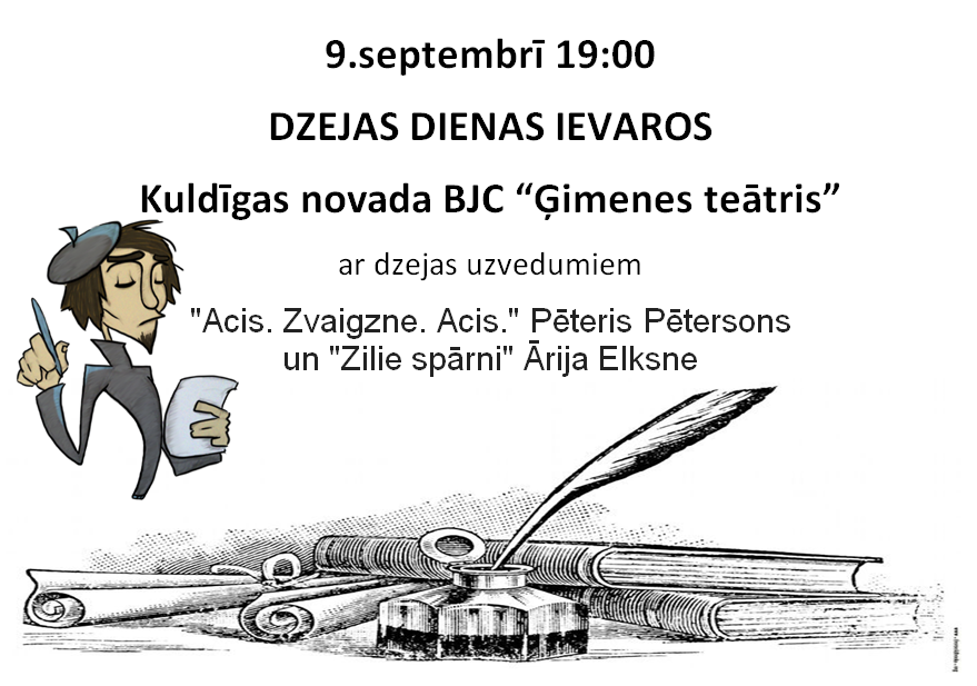 9.septembrī 19:00 Ventas ciema “Bukaišos” Kuldīgas BJC ģimenes teātris ar dzejas uzvedumiem Pēteris Pētersons “Acis. Zvaigzne. Acis.” un Ārija Elksne “Zilie spārni”