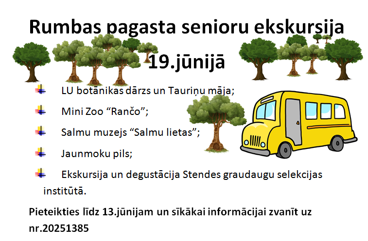 19.jūnijā Rumbas pagasta senioru ekskursija uz LU botānikas dārzu un Tauriņu māju, mini Zoo “Rančo”, salmu muzeju “Salmu lietas”, Jaunmoku pili un  ekskursija un degustācija Stendes graudaugu selekcijas institūtā. Pieteikties (no 1.jūnija līdz 13.jūnijam) un sīkākai informācijai, zvanīt uz nr.20251385