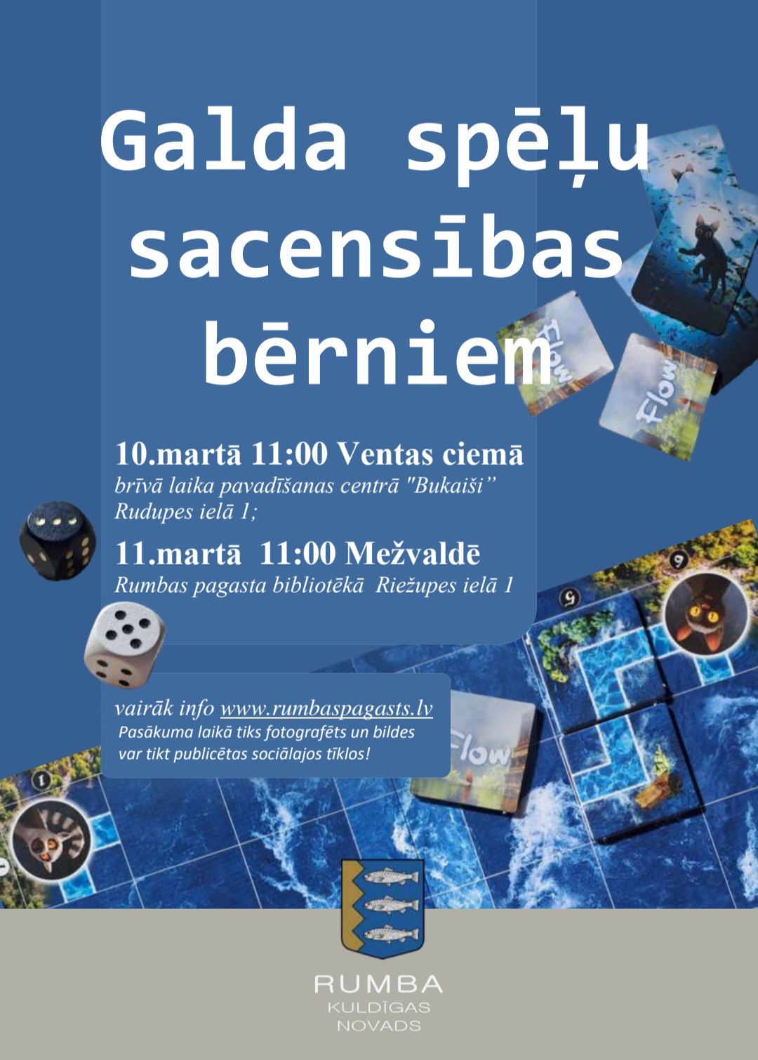 Skolēnu brīvlaikā 11:00 Galda spēļu sacensības bērniem: 10.martā Ventas ciema brīvā laika pavadīšanas centrā “Bukaiši”, Rudupes ielā 1; 11.martā Mežvaldē Riežupes ielā 1.