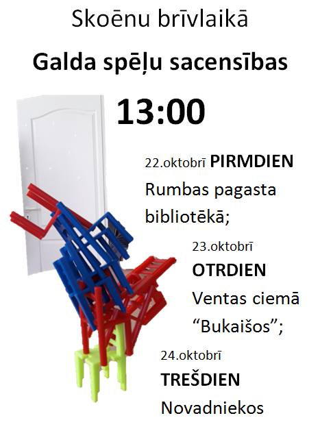 Skolēnu brīvlaikā 13:00 “Galda spēļu sacensības” 22.oktobrī Rumbas pagasta bibliotēkā; 23.oktobrī Ventas ciemā “Bukaišos”; 24.oktobrī Novadniekos