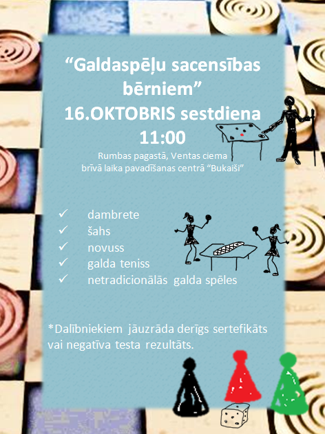 16.oktobrī Rumbas pagastā, Ventas ciema brīvā laika pavadīšanas centrā “Bukaiši” 11:00 “Galda spēļu sacensības bērniem”. Dalībniekiem jāuzrāda derīgs sertifikāts vai negatīva testa rezultāts.