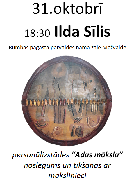 31.oktobrī 18:30 Rumbas pagasta pārvaldes nama zālē Mežvaldē  Ildas Sīlis personālizstādes “Ādas māksla” noslēgums un tikšanās ar mākslinieci.