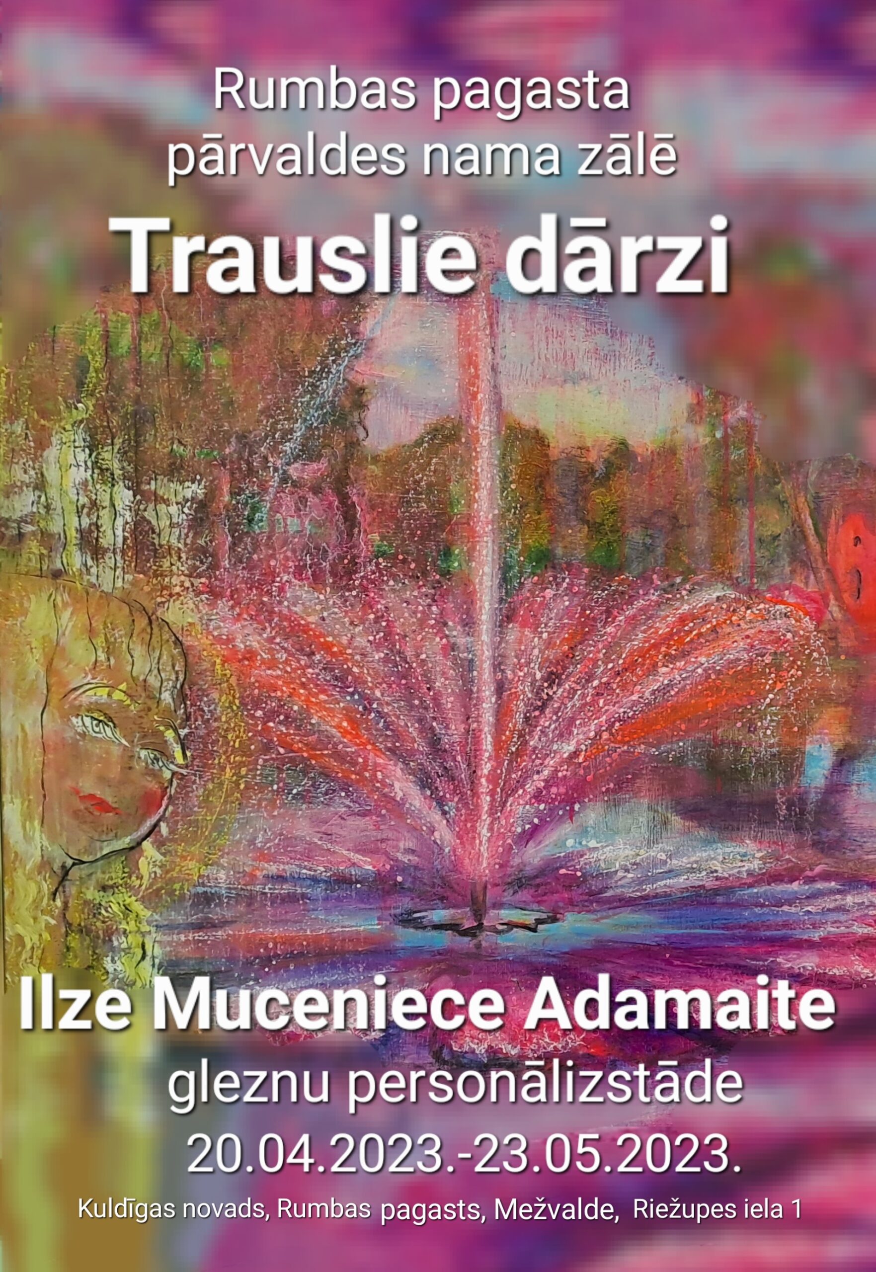 No 20.aprīļa līdz 23.maijam Ilzes Mucenieces-Adamaites gleznu personālizstāde “TRAUSLIE DĀRZI” Rumbas pagastā Rumbas pagasta pārvaldes nama zālē Mežvaldē Riežupes ielā 1