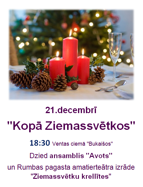 21.decembrī 18:30 Ventas ciemā “Bukaišos”. Dzied ansamblis “Avots” un pagasta amatierteātra izrāde “Ziemassvētku krellītes”
