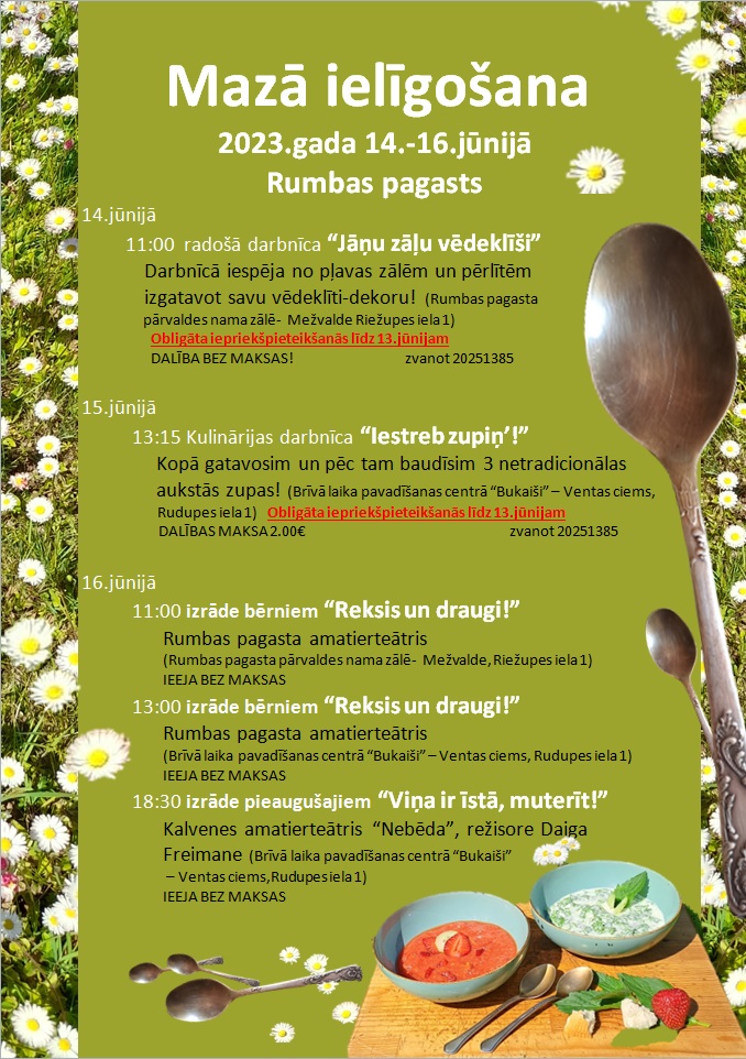 No 14.-16.jūnijam Rumbas pagasta Mežvaldē un Ventas ciemā “MAZĀ IELĪGOŠANA”: Radošā darbnīca, kulinārijas darbnīca un izrādes gan bērniem gan pieaugušajiem!