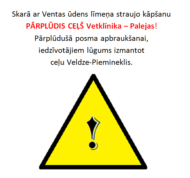 Skarā ar Ventas ūdens līmeņa straujo kāpšanu PĀRPLŪDIS CEĻŠ Vetklīnika – Palejas! Pārplūdušā posma apbraukšanai, iedzīvotājiem lūgums izmantot ceļu Veldze-Piemineklis.