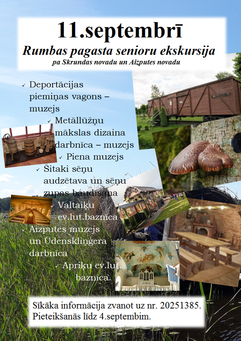 11.Septembrī Rumbas pagasta “Senioru ekskursija” pa Skrundas novadu un Aizputes novadu. Sīkāka informācija un pieteikšanās līdz 4.septembim zvanot uz nr.20251385.